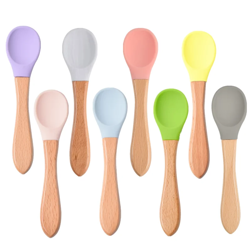 Name: Cuchara de silicona suave para bebé, cuchara de madera de aprendizaje para bebé, cuchara antideslizante, herramientas de alimentación de bebé
